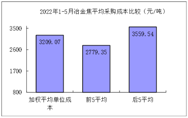 1-5月對標(biāo)企業(yè)冶金焦平均采購成本最低的前5家企業(yè)的加權(quán)平均采購成本為2779.35元/噸,比對標(biāo)企業(yè)平均采購成本低429.72元/噸,低于平均采購成本13.39%;而采購成本最高的5家企業(yè)的加權(quán)平均采購成本為3559.54元/噸,比對標(biāo)企業(yè)平均采購成本高350.48元/噸,高于平均采購成本10.92%。