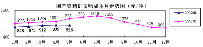 2022年5月,除煉焦煤外,其他煤焦和鐵礦石、廢鋼采購成本由升轉(zhuǎn)降。