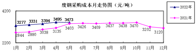 廢鋼5月份加權(quán)平均采購成本為3473.42元/噸,環(huán)比下降21.57元/噸,降幅為0.62%。1-5月累計平均采購成本為3399.03元/噸,同比升高310.43元/噸,升幅為10.05%。