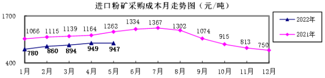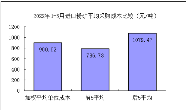 進(jìn)口粉礦5月份加權(quán)平均采購成本947.29元/噸,環(huán)比下降1.87元/噸,降幅為0.20%。1-5月累計平均采購成本為885.19元/噸,同比下降265.79元/噸,降幅為23.09%。