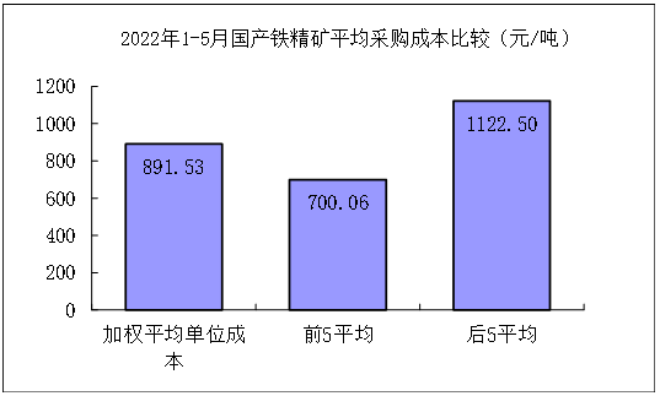 1-5月對標(biāo)企業(yè)國產(chǎn)鐵精礦折算成62%品位的平均采購成本為891.53元/噸,成本最低的前5家企業(yè)的加權(quán)平均采購成本為700.06元/噸,比對標(biāo)企業(yè)平均采購成本低191.47元/噸,低于平均采購成本21.48%;而采購成本最高的5家企業(yè)的加權(quán)平均采購成本為1122.50元/噸,比對標(biāo)企業(yè)平均采購成本高230.97元/噸,高于平均采購成本25.91%。