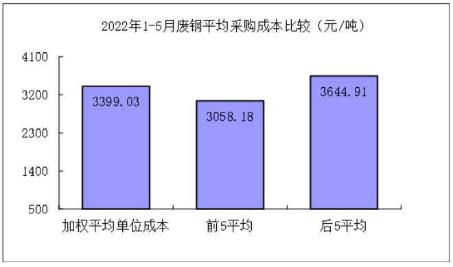 1-5月對標(biāo)企業(yè)廢鋼平均采購成本最低的前5家企業(yè)的加權(quán)平均采購成本為3058.18元/噸,比對標(biāo)企業(yè)平均采購成本低340.85元/噸,低于平均采購成本10.03%;而采購成本最高的5家企業(yè)加權(quán)平均采購成本為3644.91元/噸,比對標(biāo)企業(yè)平均采購成本高245.88元/噸,高于平均采購成本7.23%。