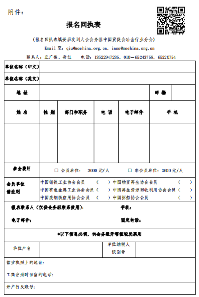 請參會代表于7月20日之前將報名回執(zhí)表(見附件)填妥后發(fā)到大會會務(wù)組中國貿(mào)促會冶金行業(yè)分會,或者掃描二維碼注冊報名。中方代表參會費為: