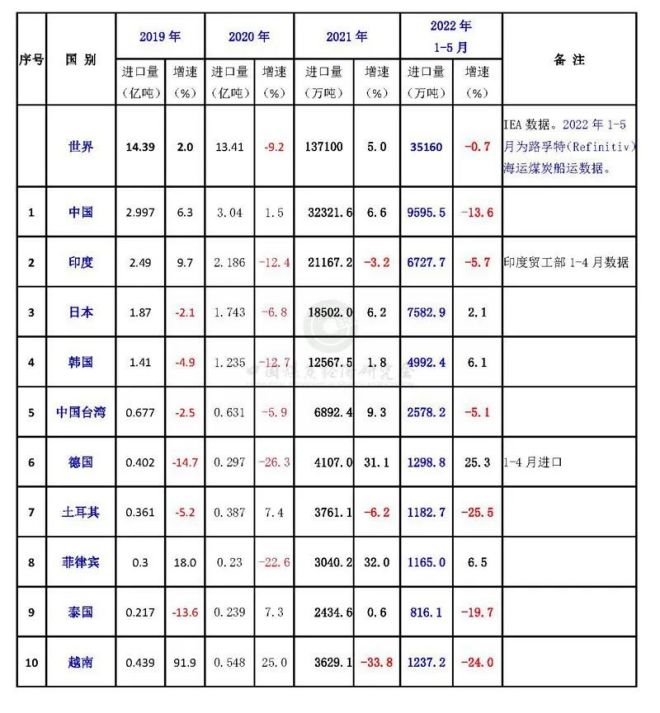 2022年1-5月全球主要煤炭進(jìn)口國(guó)和地區(qū)變化情況
