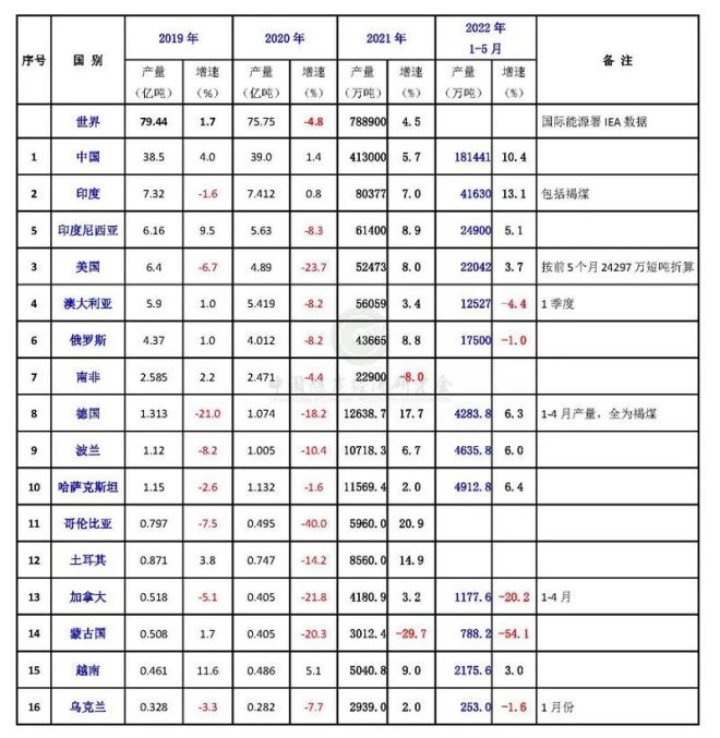 2022年1-5月全球煤炭產(chǎn)量及進(jìn)出口國(guó)等變化情況一覽