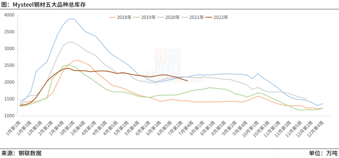 需求坍塌的同時,鋼鐵產量卻未及時響應變化。一季度冬奧會召開,京津冀地區嚴格執行限產,全國粗鋼產量24338萬噸,同比降10.5%,供應大幅下降對沖了年初需求收縮的影響,整體價格表現基本平穩。但是隨著限產結束,鋼鐵產量節節攀升,二季度粗鋼產量回升至28350萬噸,日均產量較一季度大幅增長12.7%。供需嚴重失衡,庫存也出現反季節性變化,旺季未去庫,整體呈現走平態勢。最新一期Mysteel調研五大品種庫存數據2043.02萬噸,自年內高點僅回落18%,較往年30%-50%的降幅明顯放緩。