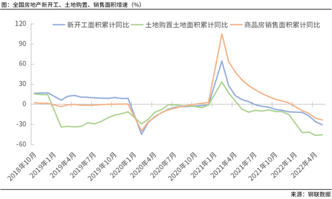 造成這一現象的原因,主要在于需求端的坍塌。從去年下半年以來,房地產運行不斷惡化,國家統計局公布的6月房地產數據仍在下行,新房開工面積同比增速創2020年2月以來新低、土地購置面積同比降48.3%,疊加疫情影響、購房預期走弱等因素,房地產行業短期“硬著陸”風險正在加劇,極大拖累用鋼需求。據測算,上半年鋼材需求同比下降9%,其中以房地產為代表的建筑業用鋼需求降幅更大,直接導致螺紋鋼需求同比下降18%。短時間內需求端的急劇萎縮,對價格及市場心態的造成較大沖擊。