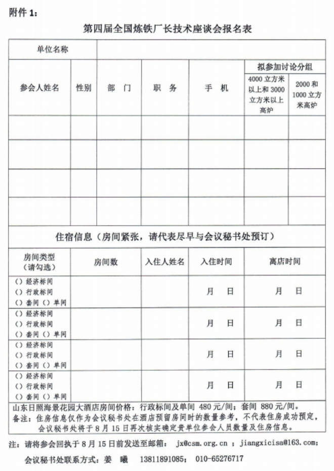 附件1. 第四屆全國煉鐵廠長技術(shù)座談會報名表