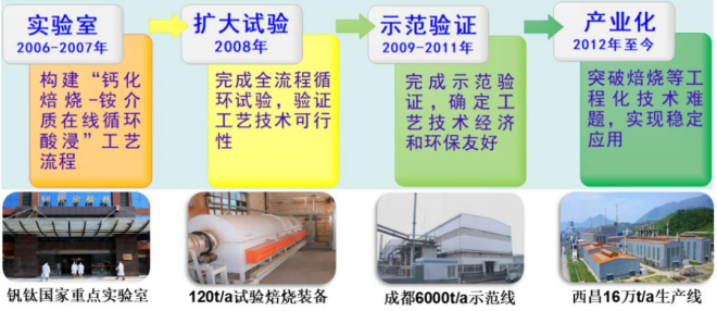2006年,鞍鋼集團(tuán)攀鋼研究院先后與重慶大學(xué)、武漢科技大學(xué)等聯(lián)手,以國家“十一五”科技支撐計(jì)劃為依托,針對傳統(tǒng)鈉鹽提釩工藝和石灰提釩工藝存在的問題,基于源頭減排的頂層設(shè)計(jì)思路,通過理論分析和大量實(shí)驗(yàn)室試驗(yàn)以及年處理120噸標(biāo)準(zhǔn)釩渣全流程擴(kuò)大試驗(yàn),構(gòu)建了“釩渣鈣化焙燒—銨介質(zhì)在線循環(huán)”提釩新工藝;以6000噸釩渣/a清潔提釩示范線為平臺,完成了工業(yè)規(guī)模的全流程試驗(yàn)驗(yàn)證和技術(shù)經(jīng)濟(jì)評估,確定了工藝技術(shù)的可行性。在此基礎(chǔ)上,設(shè)計(jì)新建了年處理16萬噸釩渣的攀鋼西昌釩制品公司,攻克了焙燒黏結(jié)和浸出裝備研發(fā)等工程化技術(shù)難題,成功實(shí)現(xiàn)新工藝產(chǎn)業(yè)化轉(zhuǎn)化;同時(shí),從末端治理和高值資源回收的角度,實(shí)現(xiàn)了廢棄物中錳、鐵、釩資源有效利用,最終形成了釩資源綠色高效利用系列關(guān)鍵技術(shù)。