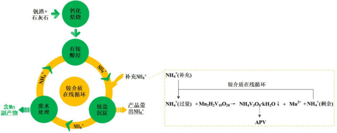 項(xiàng)目分析發(fā)現(xiàn),傳統(tǒng)提釩工藝中鈉鹽等堿金屬化合物易溶于水,在水系統(tǒng)“易進(jìn)難出”,無法有效排出是廢水難處理和固廢多的根源;進(jìn)一步推廣到堿金屬鹽類,也存在類似問題;其次,由于堿金屬鹽活性強(qiáng),高溫焙燒副反應(yīng)多,導(dǎo)致用量大,以致最終固廢種類多、量大且難處理。制取高質(zhì)量釩產(chǎn)品需要使用銨鹽作為沉淀劑,但同時(shí)也帶來了高氨氮廢水處理成本極為高昂和無法回用的難題。