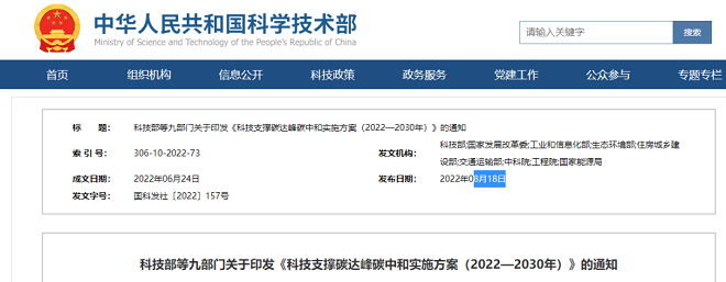 8月18日,科技部、國家發展改革委、工業和信息化部等9部門聯合印發《科技支撐碳達峰碳中和實施方案(2022—2030年)》(以下簡稱《實施方案》),統籌提出支撐2030年前實現碳達峰目標的科技創新行動和保障舉措,并為2060年前實現碳中和目標做好技術研發儲備。