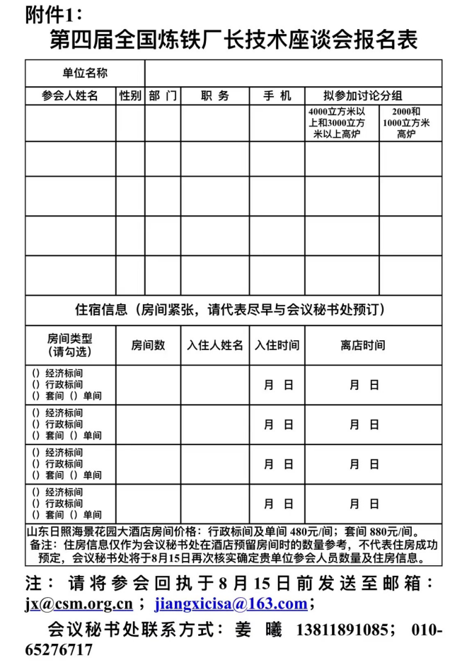 附件1. 第四屆全國煉鐵廠長技術座談會報名表