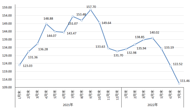 據鋼協監測,7月末,中國鋼材價格指數(CSPI)為111.46點,環比下降11.06點,降幅為9.03%,連續第三個月環比下降;同比下降42.02點,降幅為27.38%,連續第四個月同比下降。(見下圖)