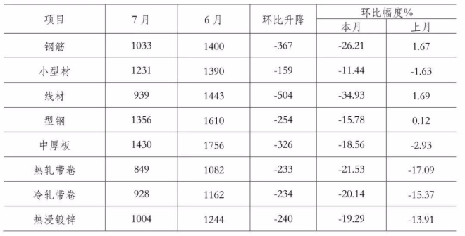 7月末,鋼協監測的八大鋼材品種價格均持續下降,且降幅均較上月有所加大。其中,高線、三級鋼筋、角鋼、中厚板、熱軋卷板、冷軋薄板、鍍鋅板和熱軋無縫管價格環比分別下降263元/噸、281元/噸、496元/噸、496元/噸、503元/噸、530元/噸、518元/噸和480元/噸。(見下表)
