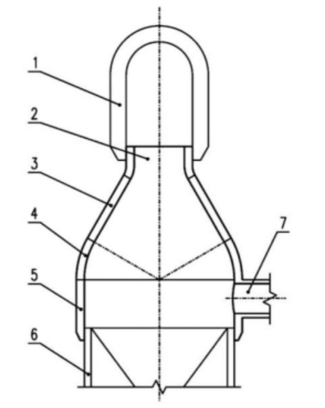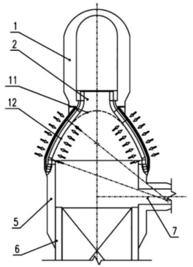 近年來,國內外熱風爐設計專家及其團隊殫精竭慮,設計踐行出不少先進適用且符合煉鐵生產安全實際的長壽高風溫熱風爐結構,推動我國熱風爐安全生產登上了新臺階。例如,首鋼一級科學家,京唐鋼鐵公司總設計師、京唐鋼鐵公司煉鐵設備專家、總工程師張福明教授結合長期穩定運行的國外獨立懸鏈線燃燒室結構和熱風爐獨立錐形拱頂結構的優越技術特點,結合現有頂燃式熱風爐爐殼開裂和熱風出口損壞垮塌等實踐研究,發明了《頂燃式熱風爐圓弧擬合懸鏈線獨立拱頂結構》新的技術成果(圖3),受到了煉鐵界的歡迎。該設計成果是對現有受力不合理的頂燃式熱風爐錐形拱頂(圖 1、圖2)實施了圓弧擬合懸鏈線結構(圖3)和獨立支撐拱頂的受力改進(圖4)。