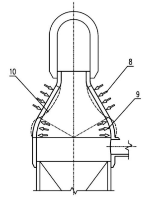 圖2為實踐中錐形砌體內襯高溫受力導致錐形砌體中部往下凸起變形、下部拱腳部位變形外擴導致耐材砌體受力和球面部位爐殼受力狀態示意圖