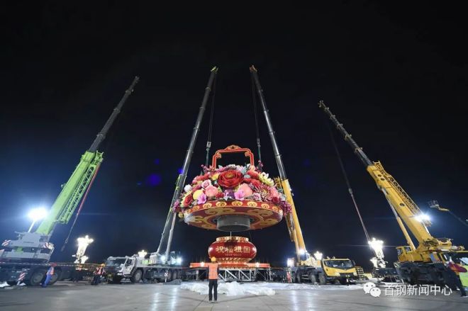 9月23日23時許,滿載著天安門廣場主題花籃鋼結構構件的24臺平板運輸車及4臺吊車順利抵達天安門廣場。經過首鋼職工連夜奮戰,2臺160噸汽車吊的默契配合,完美將籃盤和籃肚按計劃合攏,24日晚將繼續安裝剩余的坡架,25日花籃將正式與廣大游人見面。