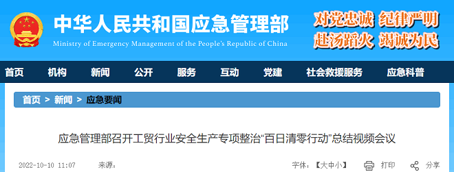 10月9日,應(yīng)急管理部以視頻方式召開工貿(mào)行業(yè)安全生產(chǎn)專項(xiàng)整治“百日清零行動”總結(jié)會議,深入學(xué)習(xí)貫徹習(xí)近平總書記關(guān)于安全生產(chǎn)重要指示精神,落實(shí)全國安全生產(chǎn)電視電話會議部署,總結(jié)“百日清零行動”工作成效,安排部署下一階段重點(diǎn)工作。應(yīng)急管理部黨委委員、副部長宋元明在主會場出席會議并講話。