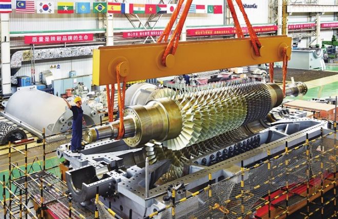 陜鼓成功研制全球最大、技術最先進的AV140軸流壓縮機,達到全球工業壓縮機領域全新高度。圖為機組吊裝現場。