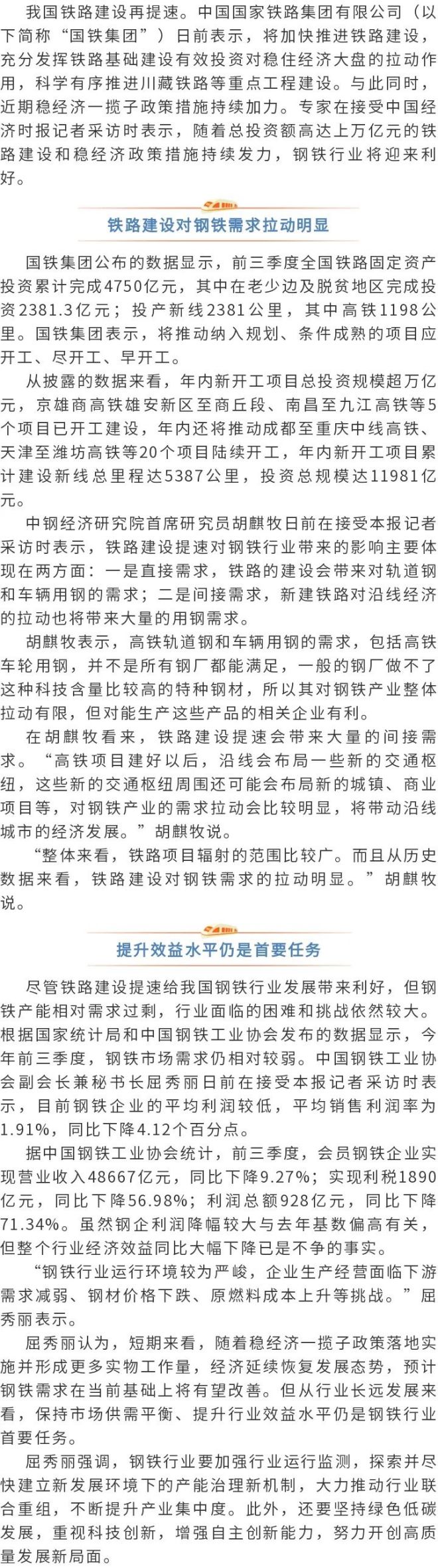 近日,中國經(jīng)濟(jì)時報發(fā)布了《鐵路建設(shè)提速利好鋼鐵行業(yè)》一文。從文中獲悉,隨著總投資額高達(dá)上萬億元的鐵路建設(shè)和穩(wěn)經(jīng)濟(jì)政策措施持續(xù)發(fā)力,鋼鐵行業(yè)將迎來利好。