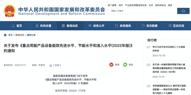 近日,國家發(fā)展和改革委員會網(wǎng)站發(fā)布了《重點(diǎn)用能產(chǎn)品設(shè)備能效先進(jìn)水平、節(jié)能水平和準(zhǔn)入水平(2022年版)》的通知(以下簡稱《通知》)。