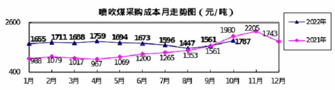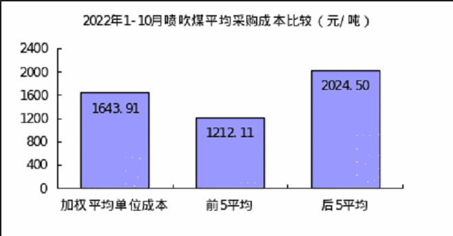 噴吹煤10月份加權平均折算成干基的采購成本為1786.70元/噸,環比升高225.87元/噸,升幅為14.47%。1-10月累計平均折算成干基的采購成本為1643.91元/噸,同比升高407.97元/噸,升幅為33.01%。