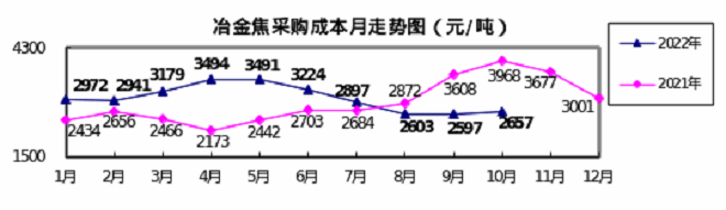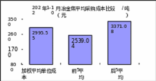 冶金焦10月份加權平均折算成干基的采購成本2657.32元/噸,環比升高60.48元/噸,升幅為2.33%。1-10月累計平均折算成干基的采購成本為2995.55元/噸,同比升高210.10元/噸,升幅為7.54%。