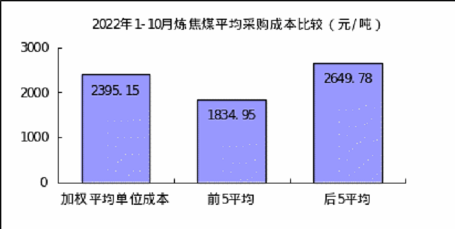 對標企業煉焦煤10月份加權平均折算成干基的采購成本為2225.52元/噸,環比升高70.70元/噸,升幅為3.28%。1-10月累計平均折算成干基的采購成本為2395.15元/噸,同比升高660.58元/噸,升幅為38.08%。
