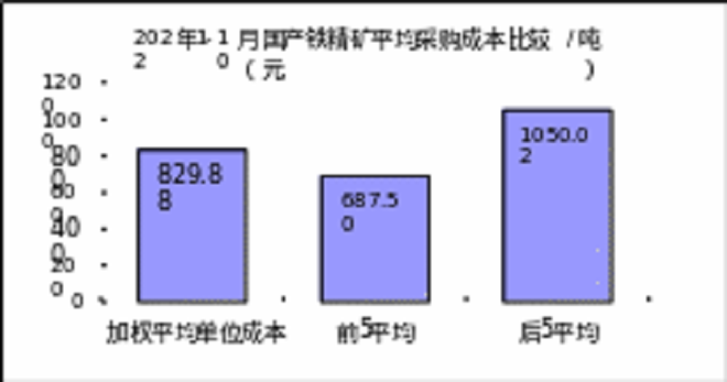 1-10月對標企業國產鐵精礦折算成62%品位的平均采購成本為829.88元/噸,成本最低的前5家企業的加權平均采購成本為687.50元/噸,比對標企業平均采購成本低142.38元/噸,低于平均采購成本17.16%;而采購成本最高的5家企業的加權平均采購成本為1050.02元/噸,比對標企業平均采購成本高220.14元/噸,高于平均采購成本26.53%。