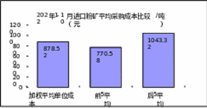 1-10月對標企業進口粉礦折算成62%品位的平均采購成本為878.52元/噸,成本最低的前5家企業的加權平均采購成本為770.58元/噸,比對標企業平均采購成本低107.94元/噸,低于平均采購成本12.29%;而采購成本最高的5家企業加權平均采購成本為1043.32元/噸,比對標企業平均采購成本高164.80元/噸,高于平均采購成本18.76%。