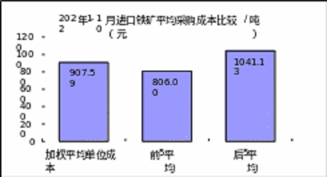 進口粉礦10月份加權平均采購成本847.56元/噸,環比升高75.16元/噸,升幅為9.73%。1-10月累計平均采購成本為864.51元/噸,同比下降310.60元/噸,降幅為26.43%。