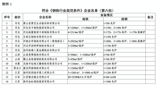 12月6日,從中華人民共和國工業(yè)和信息化部網(wǎng)站獲悉,根據(jù)《鋼鐵行業(yè)規(guī)范條件(2015年修訂)》和《鋼鐵行業(yè)規(guī)范企業(yè)管理辦法》,工信部開展了鋼鐵規(guī)范企業(yè)動態(tài)調(diào)整工作。