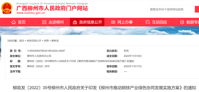 柳州市推動鋼鐵產業綠色協同發展實施方案