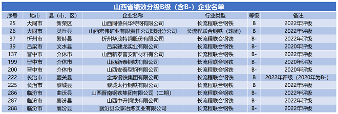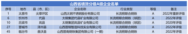 山西省公布鋼鐵行業(yè)績效名單:5家A級、12家B級