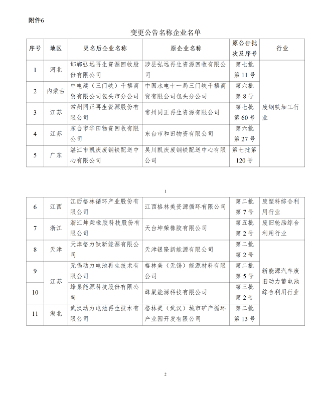 近日,工業和信息化部對符合《廢鋼鐵加工行業準入條件》企業名單(第十批)、符合《廢紙加工行業規范條件》企業名單(第一批)、符合《廢塑料綜合利用行業規范條件》企業名單(第六批)、符合《廢舊輪胎綜合利用行業規范條件》企業名單(第三批)、符合《新能源汽車廢舊動力蓄電池綜合利用行業規范條件》企業名單(第四批),以及變更、撤銷相關行業規范公告的企業名單予以公告。