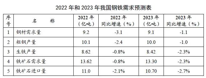 12月20日,冶金工業規劃研究院發布2023年中國和全球鋼鐵需求預測,預計2022年我國鋼材消費量為9.2億噸,同比下降3.1%;預測2023 年我國鋼材需求量為9.1億噸,同比下降1.1%。根據鋼材消費量和鋼材、鋼坯凈出口分析,預測2022年和2023年我國粗鋼產量分別為10.1億噸和10.0億噸,同比分別下降2.4%和1.0%。