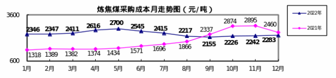 對標企業煉焦煤12月份加權平均折算成干基的采購成本為2282.61元/噸,環比升高40.83元/噸,升幅為1.82%。1—12月累計平均折算成干基的采購成本為2374.19元/噸,同比升高473.43元/噸,升幅為24.91%。