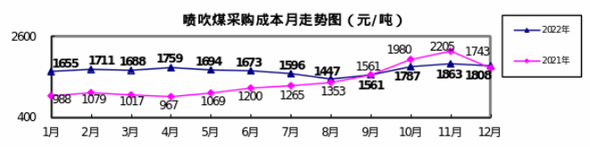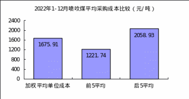噴吹煤12月份加權平均折算成干基的采購成本為1808.31元/噸,環比下降54.28元/噸,降幅為2.91%。1—12月累計平均折算成干基的采購成本為1675.91元/噸,同比升高327.72元/噸,升幅為24.31%。