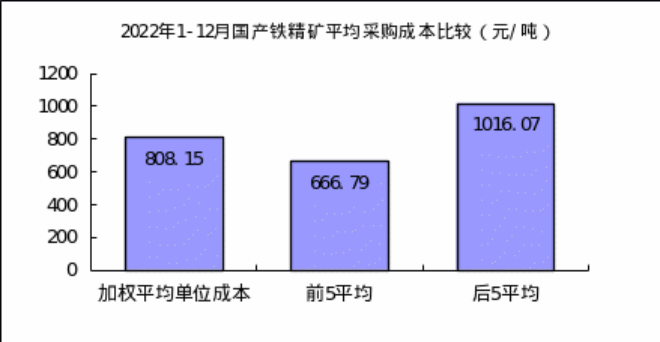 1—12月對標企業國產鐵精礦折算成62%品位的平均采購成本為808.15元/噸,成本最低的前5家企業的加權平均采購成本為666.79元/噸,比對標企業平均采購成本低141.36元/噸,低于平均采購成本17.49%;而采購成本最高的5家企業的加權平均采購成本為1016.07元/噸,比對標企業平均采購成本高207.92元/噸,高于平均采購成本25.73%。