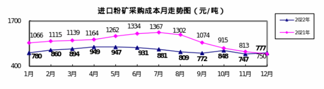 進口粉礦12月份加權平均采購成本776.55元/噸,環比升高29.40元/噸,升幅為3.94%。1—12月累計平均采購成本為841.30元/噸,同比下降268.07元/噸,降幅為24.16%。