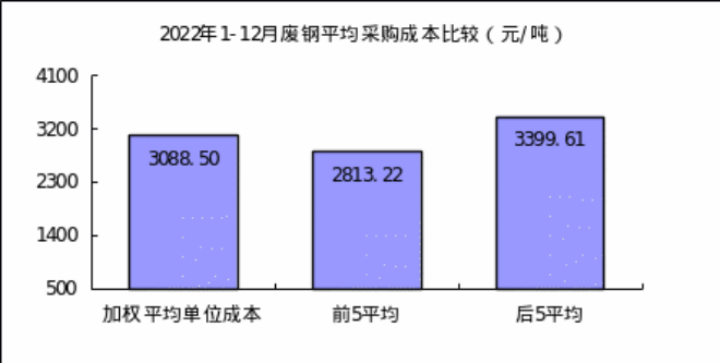 廢鋼12月份加權平均采購成本為2694.17元/噸,環比升高110.88元/噸,升幅為4.29%。1—12月累計平均采購成本為3088.50元/噸,同比下降151.21元/噸,降幅為4.67%。