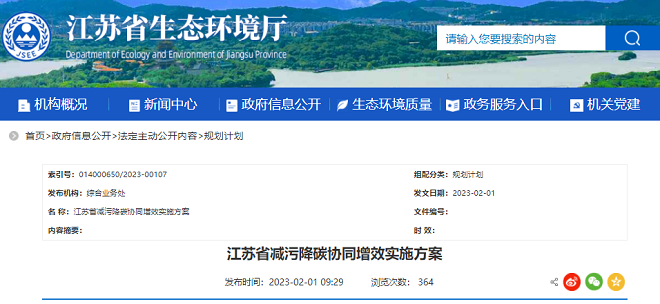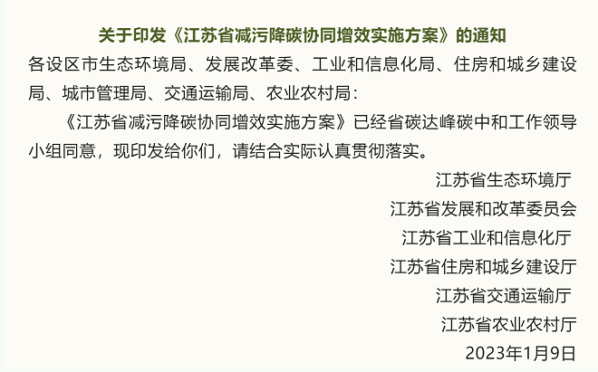 近日,江蘇省生態(tài)環(huán)境廳網(wǎng)站發(fā)布了《江蘇省減污降碳協(xié)同增效實施方案》(以下簡稱《方案》)。