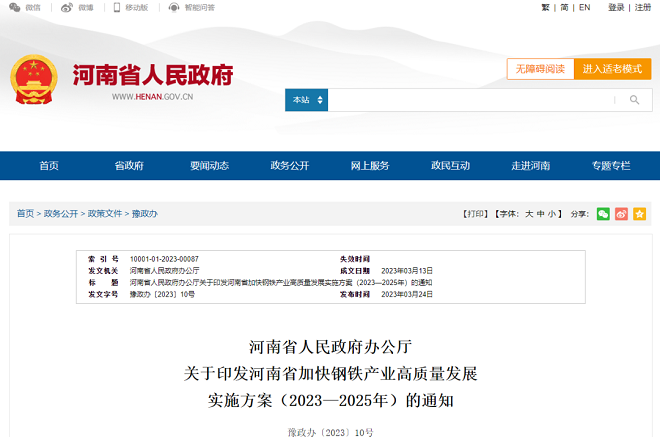 近日,河南省人民政府網站發布了《河南省人民政府辦公廳關于印發河南省加快鋼鐵產業高質量發展實施方案(2023—2025年)的通知》(以下簡稱《通知》)。