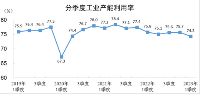 一季度,全國工業(yè)產能利用率為74.3%,比上年同期下降1.5個百分點,比上季度下降1.4個百分點。