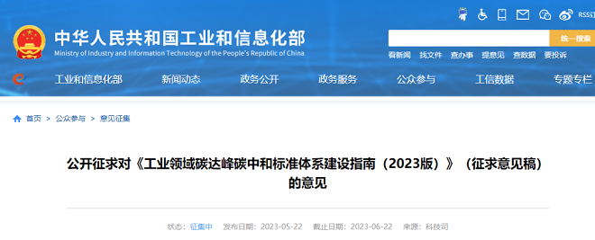 公開征求對《工業(yè)領(lǐng)域碳達(dá)峰碳中和標(biāo)準(zhǔn)體系建設(shè)指南(2023版)》(征求意見稿)的意見