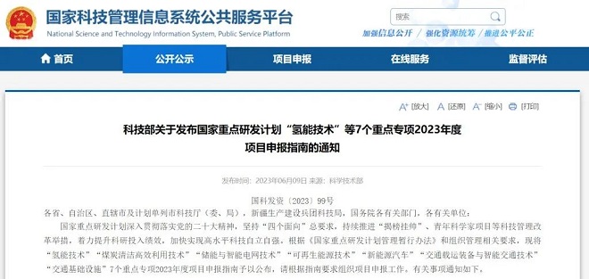 6月9日,科技部發布關于國家重點研發計劃“氫能技術”等7個重點專項2023年度項目申報指南的通知。