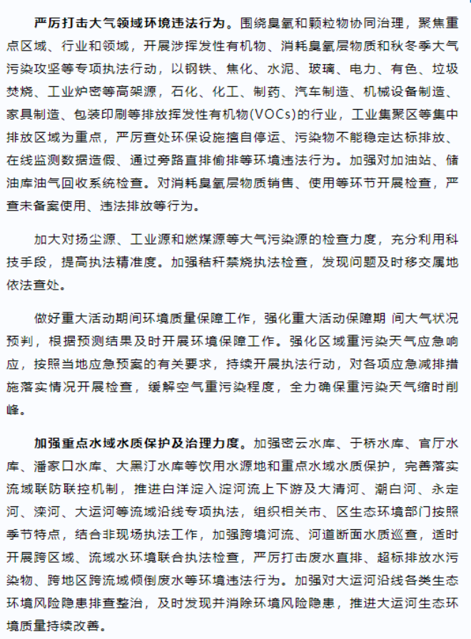 為深化京津冀生態環境執法聯動工作機制,保障區域環境安全,推進區域生態環境質量穩定改善,近日,京津冀生態環境執法聯動工作領導小組制定了《2023-2024年京津冀生態環境聯合聯動執法工作方案》,對2023年6月至2024年5月期間京津冀生態環境執法重點工作進行安排部署,明確將重點圍繞大氣、水、固體廢物、移動源、打擊第三方環保服務機構違法五個方面開展聯動執法。
