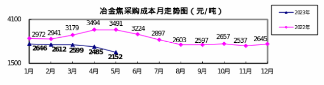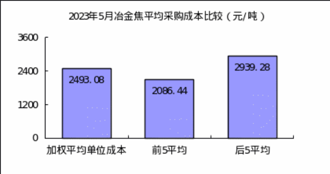 冶金焦5月份加權(quán)平均折算成干基的采購(gòu)成本2152.28元/噸,環(huán)比下降332.61元/噸,降幅為13.39%。1-5月累計(jì)平均折算成干基的采購(gòu)成本為2493.08元/噸,同比下降715.99元/噸,降幅為22.31%。