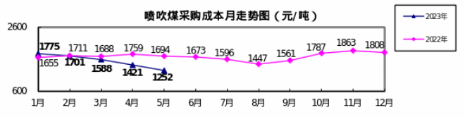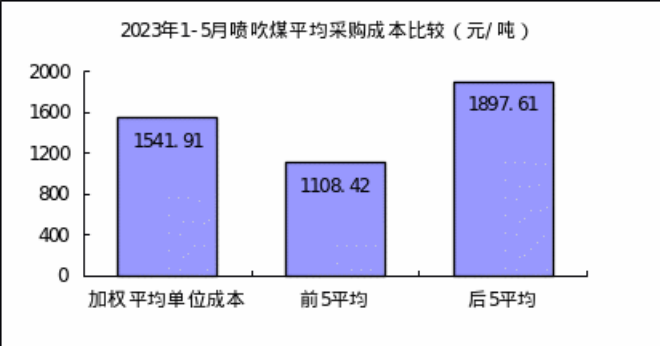 噴吹煤5月份加權(quán)平均折算成干基的采購(gòu)成本為1252.27元/噸,環(huán)比下降168.27元/噸,降幅為11.85%。1-5月累計(jì)平均折算成干基的采購(gòu)成本為1541.91元/噸,同比下降136.79元/噸,降幅為8.15%。