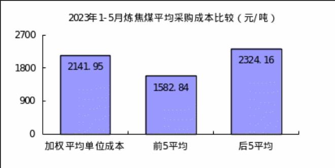 1-5月對(duì)標(biāo)企業(yè)煉焦煤平均采購(gòu)成本最低的前5家企業(yè)折算成干基的加權(quán)平均采購(gòu)成本為1582.84元/噸,比對(duì)標(biāo)企業(yè)平均采購(gòu)成本低559.11元/噸,低于平均采購(gòu)成本26.10%;而采購(gòu)成本最高的5家企業(yè)的加權(quán)平均采購(gòu)成本為2324.16元/噸,比對(duì)標(biāo)企業(yè)平均采購(gòu)成本高182.21元/噸,高于平均采購(gòu)成本8.51%。